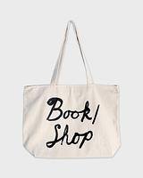 Introducing our latest canvas bag, a big, big shopper tote with a zippered top & 6 1/2 inch square zippered inside pocket. Use it for anything; picnics, laundry, groceries, (we even use it for books!). Natural medium-weight canvas with a large silk-screened BOOK/SHOP logo in black. Printed in Oakland, California.